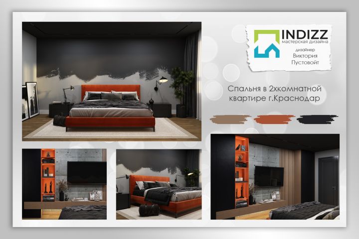 Заказчик - молодой человек - хотел создать в спальне глубокую атмосферу с большим количеством темных оттенков. Было также принято решение использовать яркий оранжевый цвет, чтобы освежить интерьер и избежать мрачного настроения.