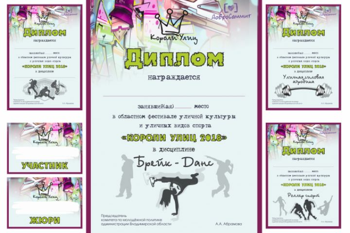 Дипломы "Короли улиц" в разных номинациях. Формат А4. Бейджи 9х6 см.