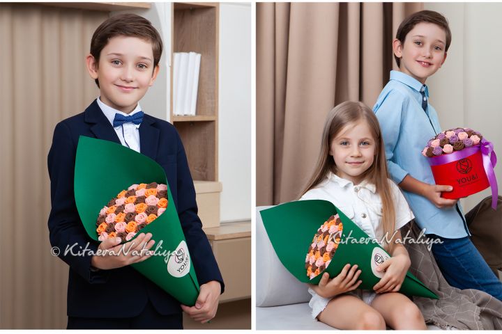 рекламная фотосъёмка шоколадных конфет с участием маленьких фотомоделей к 1-ому сентября