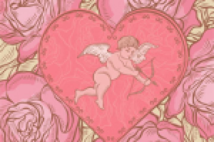 Векторная красочная иллюстрация с стилизованными цветами роз, сердцем и Амуром.