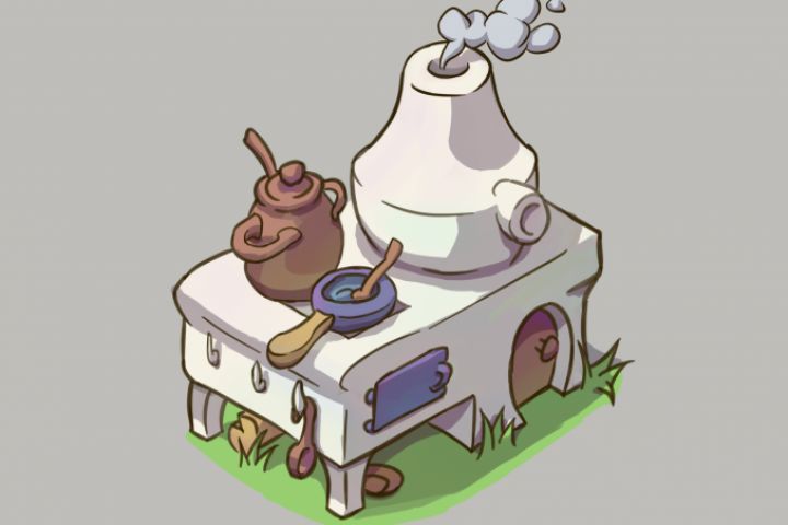 Было сделано, как пример на курсе графики. Мне она понравилась, решил покрасить и добавить тень. Предполагается использовать, как объект интерьера в деревне. Принадлежит НПС бабушке. Она готовит на свежем воздухе на всю сенью. Жанр РПГ.