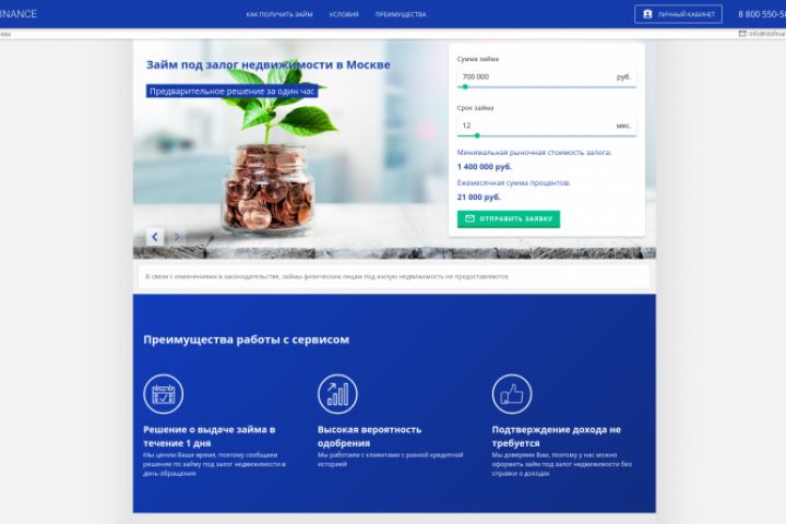 Лендинг с поддеркой автоопределения геолокации пользователя. Страницы адаптированы под региональные запросы. Результаты вычислений встроенного калькулятора прикрепляются к заявке.