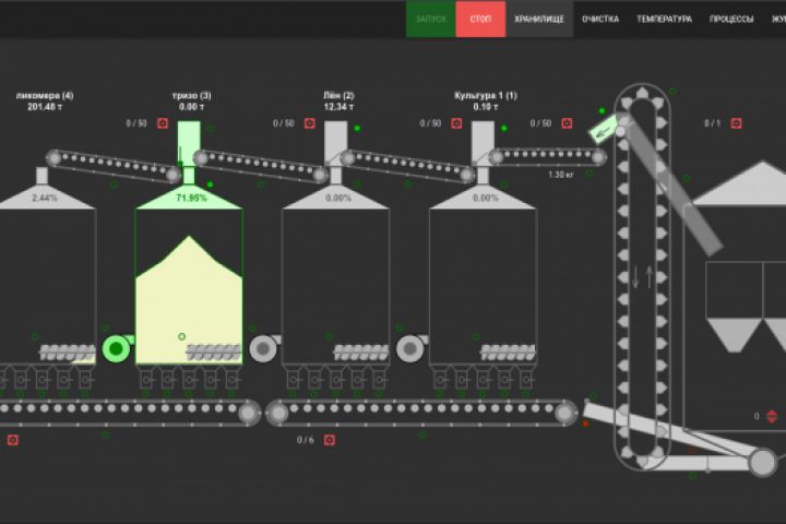 Веб-интерфейс автоматизированной системы управления зернохранилищем и системой очистки зерна.