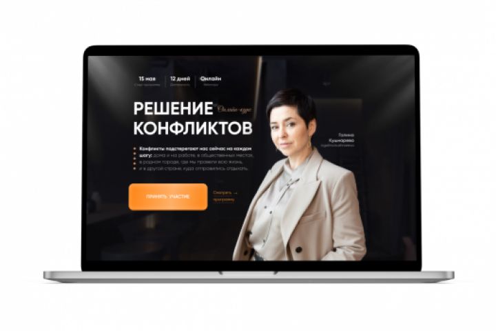 Лендинг разработан для заказчика в сфере инфобизнеса для регистрации на курс по конфликтам, с привязкой платформы GetCourse, для выдачи доступа к обучению и приема оплат