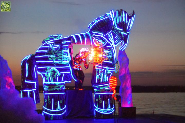 Декорация-ширма с дверью, предназначена для выступлений на крупных площадках. Например он несколько лет был базой "Вирусов-мутирусов" на новогодних представлениях "Волшебный код Деда Мороза" в гостинице "Космос". Представляет из себя разборную конструкцию из 8 частей с металлическим каркасом и полимерным покрытием , декорирован светоотражающими материалами и гибким неоном. Размер-4,5/3,5м. Вес 220кг.