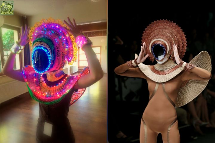 Сплетен из полимерных трубок и украшен светодиодной подсветкой.