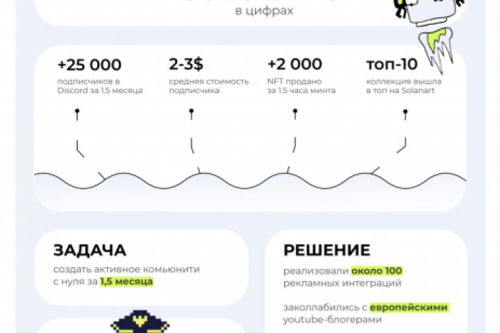 Продажа коллекции 2800 NFT по 300$ на Solanart. Ведение социальных сетей Twitter и Discord, работа с инфлюенсерами, привлечение в Discord 25000 пользователей за 1,5 месяца.