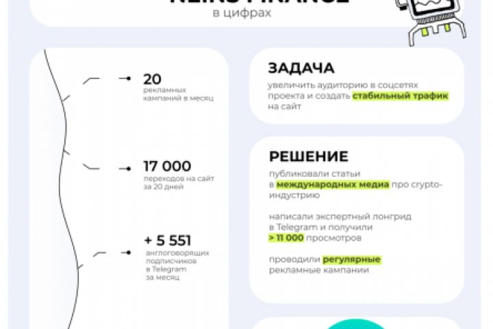 Привлечение порядка 6000 пользователей в Telegram за 1 месяц, стоимость пользователя 0,92$. Трафик на сайт проекта - 17 000 переходов за 20 дней рекламных интеграций.