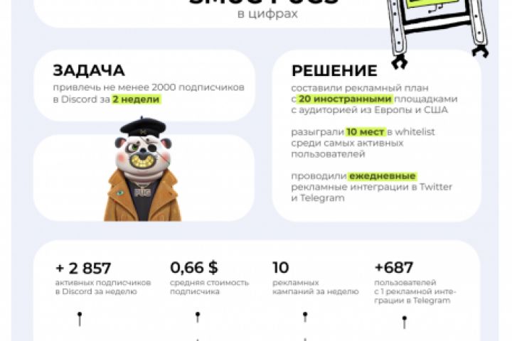 Привлекли +2800 живых подписчиков в Discord за 2 недели со средней стоимостью подписчика в 0,66$. Получили приход в +600 пользователей с 1 рекламной интеграции в Telegram.