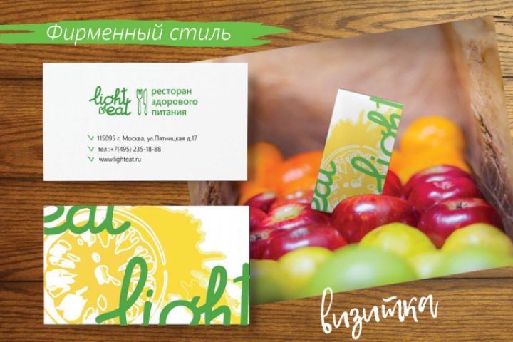 Двухсторонняя визитка для ресторана light eat. Шрифтовой логотип с иконкой в стиле hand made. Символизирует фермерское, здоровое, сбалансированное питание.