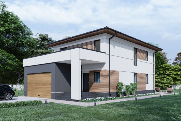 Ещё один вариант фасада дома. Штукатурка двух цветов, белого и тёмно-серого цвета, а также элементы фасада из деревянной обрешетки!