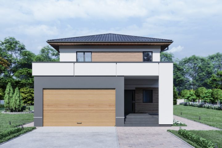 Ещё один вариант фасада дома. Штукатурка двух цветов, белого и тёмно-серого цвета, а также элементы фасада из деревянной обрешетки!