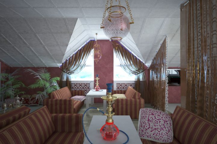 Интерьер кальянной разработан в красных тонах, в восточном стиле.