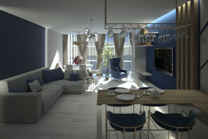Гостиная в ЖК "Прилесье" Тольятти выполнена в современном стиле. Вся квартира выполнена со смешением нескольких стилей. Выполнено несколько визуализаций с одноуровневыми и двухуровневыми потолками.