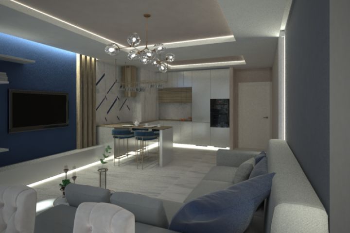 Гостиная в ЖК "Прилесье" Тольятти выполнена в современном стиле. Вся квартира выполнена со смешением нескольких стилей. Выполнено несколько визуализаций с одноуровневыми и двухуровневыми потолками.