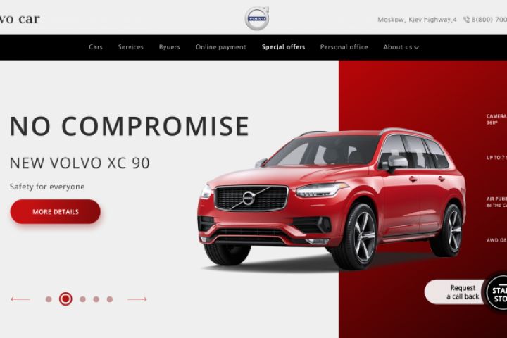 Мною был разработан главный экран для дилера Volvo. Шапка осталась практически без изменений, так как это сбивало бы столку клиентов, которые являются постоянными. А вот концепция всего остального кардинально отличается от привычного главного экрана у Volvo.