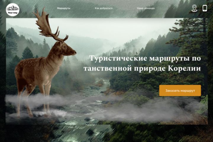 Макет первого экрана сразу помогает клиенту понять, на каком сайте он находится и какие основные услуги на сайте предоставляют. Полное погружение в атмосферу природы подталкивает пользователей желанию выбраться на природу, расслабиться, отдохнуть от городской суеты именно благодаря этому турагентству. А эффект тумана и изображение величавого оленя еще больше распаляют интерес и желание узнать что-то таинственное , сокрытое от людских глаз.