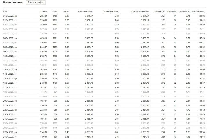 После аудита и проведенных работ цена клика снижена в 4 раза. Конверсия стала выше. Как итог - уменьшение стоимости цели почти в 10 раз. Ниже приведены результаты на апрель 2020 года Средняя стоимость заявки около 140 руб.