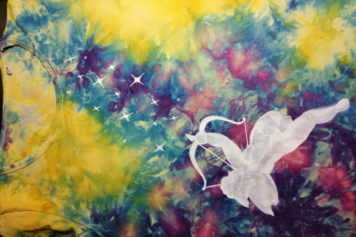 Роспись выполнена в технике тай-дай + на правой лопатке небольшая цитата про купидона)
