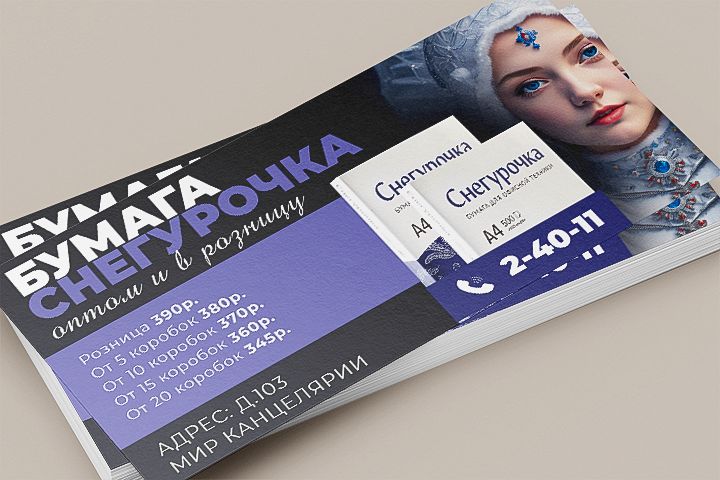 Разработать дизайн рекламного флаера для продвижения офисной бумаги «Снегурочка» с акцентом на выгодные оптовые цены.