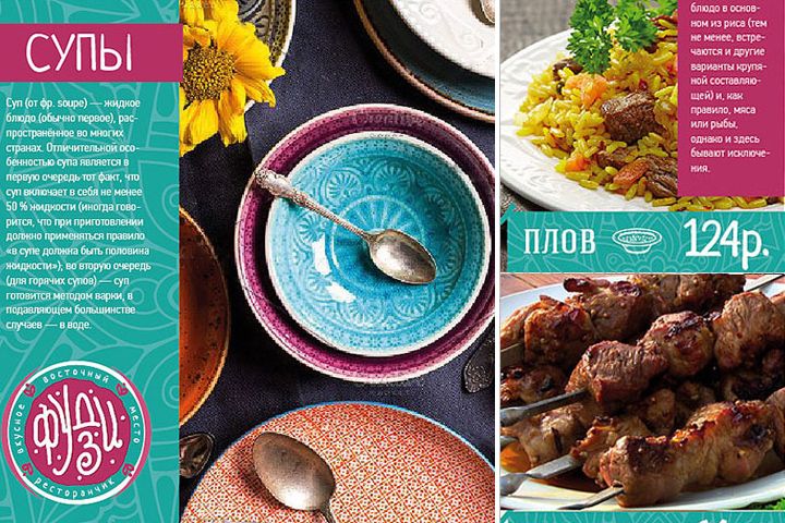 Контрастная подача: Сочные, крупные фотографии блюд размещены вплотную к бирюзовому фону. Этот цветовой контраст визуально «выталкивает» еду, делая ее максимально аппетитной и реалистичной.