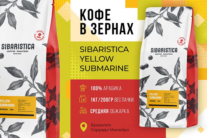 Sibaristica Coffee Roasters (Санкт-Петербург). Продукт: Кофе в зернах «Yellow Submarine» (Эспрессо смесь, 100% арабика). Контекст: Упаковка товара выполнена в минималистичном белом стиле. В выдаче маркетплейсов (Wildberries/Ozon) на белом фоне упаковка может «теряться» и выглядеть блекло. Цель: Разработать яркую, кликабельную главную карточку товара, которая: Выделит продукт среди конкурентов в поисковой выдаче. Мгновенно донесет ключевые характеристики (вес, обжарка, происхождение) без необходимости заходить внутрь карточки.