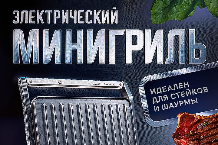 Стилистика Dark Mode: Выбран глубокий темный фон с текстурой камня/грифеля. Это создает премиальный вид и служит идеальной подложкой для демонстрации «металлических» поверхностей и ярких продуктов. Заголовок «МИНИГРИЛЬ» выполнен в крупном, объемном стиле с металлической текстурой. Это визуально рифмуется с материалом самого гриля и придает весомости товару.