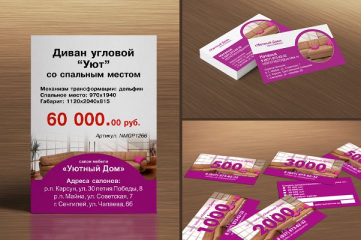 Для мебельного магазина: 1. ценник а4 2. карты на скидку 3. визитка