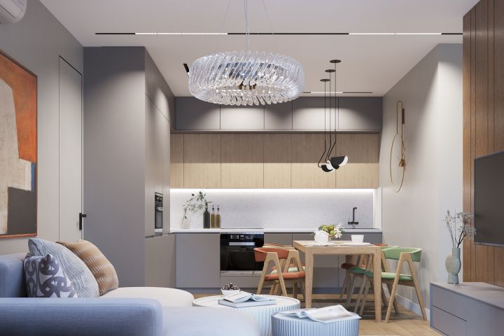 Интерьер кухни-гостиной в серых тонах с элементами дерева создает современное и стильное пространство, где гармонично сочетаются уют и функциональность. Основной цветовой фон представлен в мягких серых оттенках, что придает комнате элегантный и спокойный вид. Оригинальные журнальные столики в форме чаши добавляют уникальности. Катрита на стене, стулья оранжевого и зеленого оттенков добавляют яркие цветовые акценты. Оригинальные светильники, выполненные в современном стиле, не только обеспечивают необходимое освещение, но и служат эффектными декоративными элементами. Большая функциональная кухня с современными бытовыми приборами и удобной планировкой предлагает все необходимое для комфортного приготовления пищи и общения с гостями. Стеновая панель из массива дерева придает интерьеру натуральность и тепло, подчеркивая связь с природой. Встроенная подсветка, расположенная вдоль кухонной зоны и в других частях помещения, создает мягкое освещение, добавляя уют и акцентируя внимание на ключевых элементах дизайна. В итоге, этот интерьер кухни-гостиной представляет собой стильное пространство, идеально подходящее для семейных встреч и дружеских собраний.