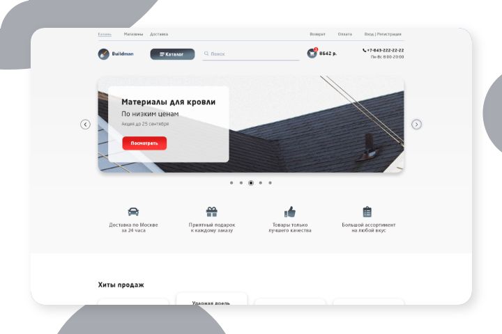 Поставил себе задачу создать простой и "лёгкий" сайт для строительного интернет-магазина. В данном случае решил буквально убрать всё лишнее, и сосредоточить всё внимание потенциального покупателя на действующую в магазине акцию, а также на имеющихся в магазине товарах. Слайдер из рекламных баннеров призван вызвать коммерческий интерес у клиентов, при этом реклама в целом на сайте не является навязчивой и "надоедливой". Преимуществами данного дизайна являются простота и удобство в пользовании сайтом.