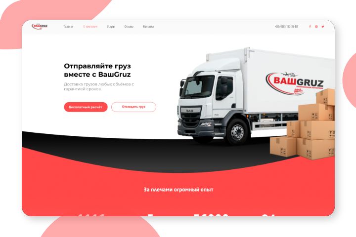 Перед началом выполнения работы передо мной стояла задача, создать современный, красивый, "легкий" дизайн логистической компании. Цель состояла в том, чтобы клиент после просмотренной информации заинтересовался услугами компании и захотел бесплатно рассчитать стоимость доставки. Красный, черный и белый цвета, изогнутые фигуры и наглядные иллюстрации и иконки придают дизайну яркость, "сочность" и живость.