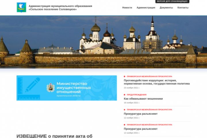 Сайт для администрации муниципального образования "Сельское поселение Соловецкое". Один из первых моих полностью самостоятельных проектов. Разработан на CMS Bitrix, собственный дизайн.