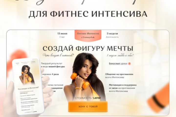 Был разработан одноэкранник под запуск курса от блогера по фитнесу. Был разработан дизайн одноэкранника, представлено несколько вариантов , далее верстка сайта на Tilda ,подключение оплаты с помощью тинькофф.
