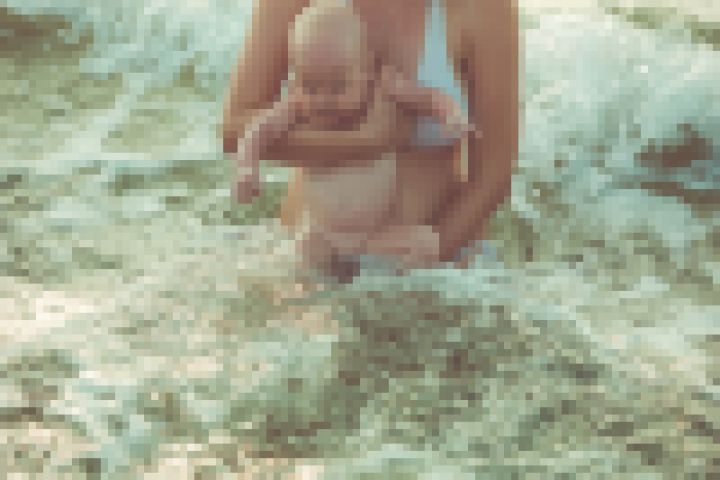 Мама купает дочку в морских волнах. ш. Гоа, Индия