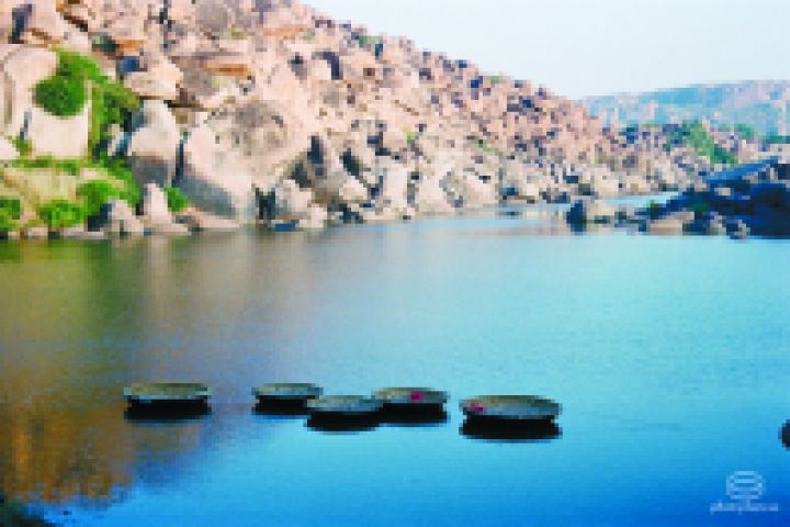 Лодки - блюдечки плывут по поверхности реки, прокладывающей свой путь через массивные гранитные валуны. Рассвет на реке в Хампи, ш. Карнатака, Индия.