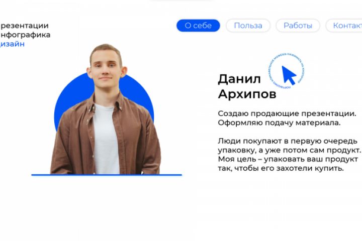 В портфолио есть несколько работ, тематика большинства из них - образование. Несмотря на это, я откликаюсь на различные заказы, чтобы каждый раз улучшать свой продукт. Также я добавляю анимацию в презентацию, что создает эффект "свежего" дизайна. Это всё обговаривается индивидуально.