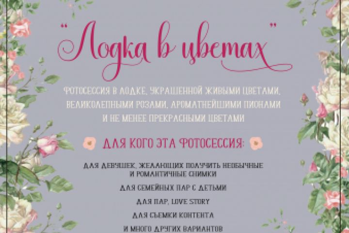 Плакат на фотосессию в лодке, украшенной цветами. Плюс подарочный сертификат во вложении.