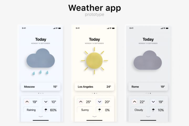 Прототип мобильного приложения для отслеживания прогнозов погоды. Прототип выполнен используя Figma.
