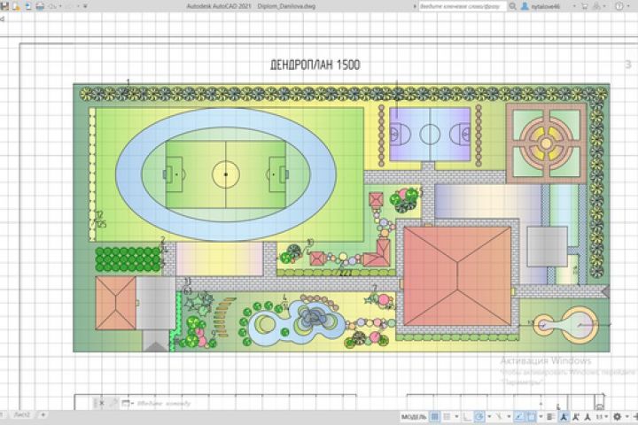 Дендроплан школы-интерната, к нему имеется ситуационный, разбивочный, план маф и оборудования, план дорожек и площадок, календарный план-график, смешная документация, описание объекта