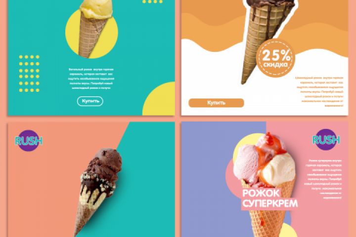 Web баннеры для сайта и магазинов мороженного для использования на сайте и магазинах социальных сетей. Яркие цвета разной тональности для презентации разных категорий рожков.