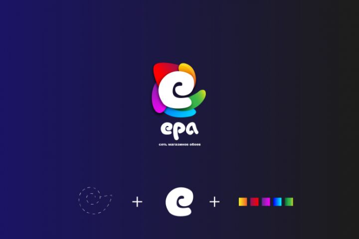 Простая концепция - завернутый рулон обоев, по его кругу завернута буква Е символизирующая название магазина. Остальные буквы выполнены декоративно, персонально отрисованы для логотипа и конечным этапом является 5 разноцветных градиентных кусков, как результат большого яркого выбора магазина