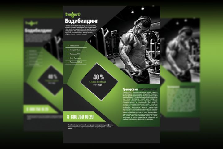 Чтобы отобразить динамику и контраст листовки были определены ярко зеленые и чёрно-белые тона. Спорт зал - это оживленное место, где происходят выплески энергии. Зелёный отлично оживляет, а черно-белый хорошо контрастирует