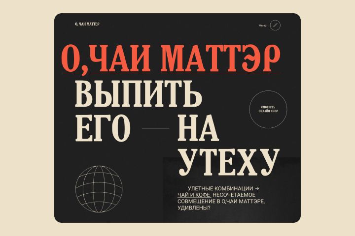 Задача: Сделать дизайн сайта крафтового чая Решение: Использовать не стандартную сетку Мягкие крафтовые цвета Стиль фестивального сайта Результат: Дизайн сайта получил награду, как лучшая работа с сеткой