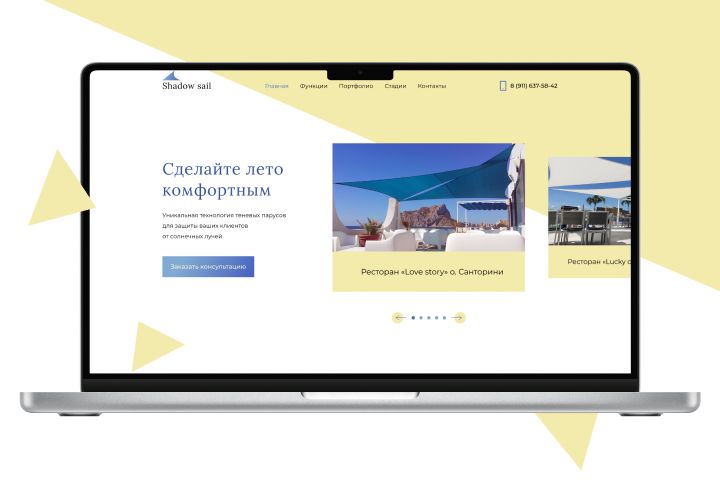 Shadow sail-сайт теневых парусов, направленный на B2B продажи. Исходя из этого, был разработан макет, который не включает в себя излишество дизайнерских элементов, чтобы максимально подробно донести всю информацию о продукте для бизнеса клиента и показать преимущества над конкурентами, в данном случае производителями солнечных зонтов.