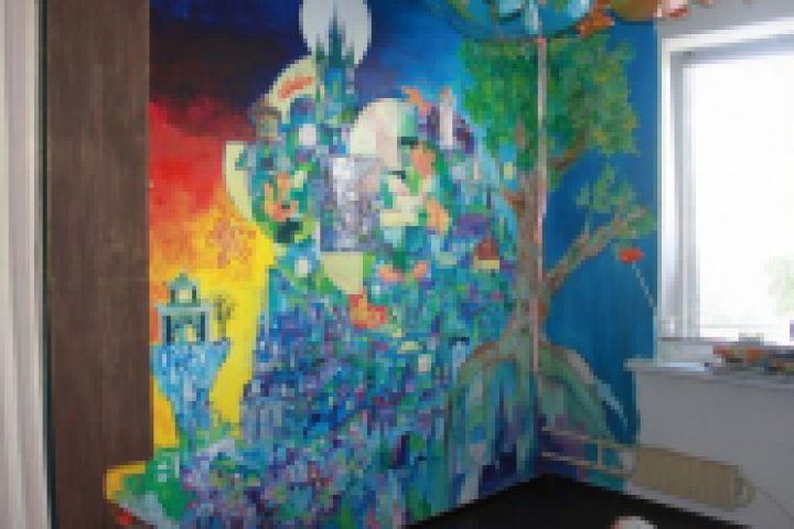 стена расписывалась жидким концентратом краски , также использовалась стеклянная и пластиковая мозаика, краски по стеклу.