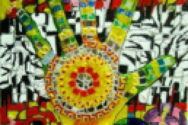 В стиле Хундертвассера. Сделано красками на стекле с использованием зеркала и стеклянной мозаики.