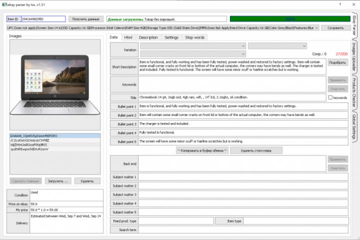 Программное обеспечение было разработано для парсинга товаров из интернет-магазина Ebay споследующим экспортом данных товаров с различными вариациями, описанием, наценкой, ключевыми словами в excel таблицу.