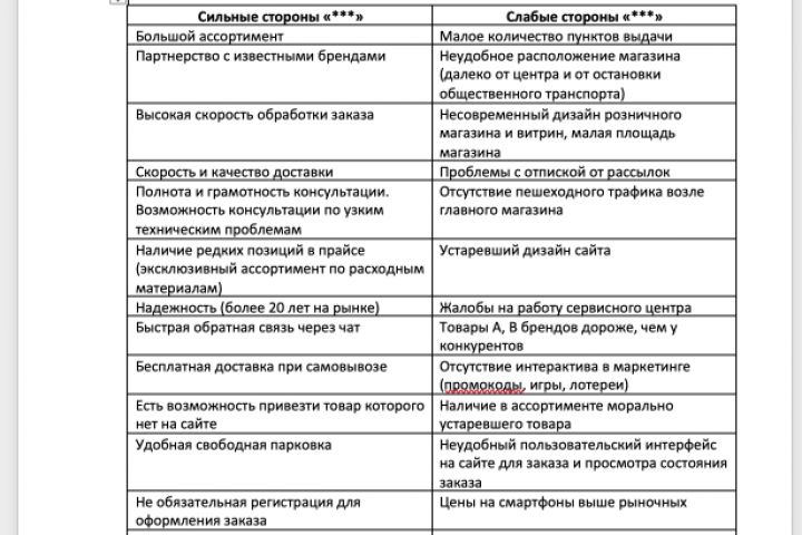 Могу подготовить SWAT анализ или любой другой маркетинговый документ