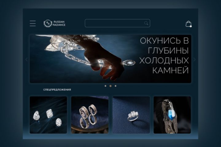В проекте интернет-магазина для компании Russian Radiance мне хотелось подчеркнуть эстетику ювелирного искусства и сделать так, чтобы пользователь, зайдя на страницу магазина, постепенно погружался в интерфейс, со временем даже забывая что он находится в интернете. Минимализм, утончённость и нотка аристократизма никогда не бывает лишней для темы ювелирных украшений.