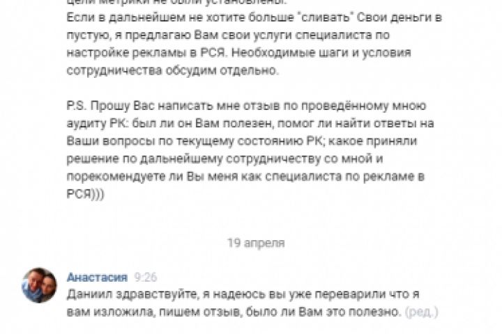 Изначально проведен аудит работающей рекламной компании. далее проведён аудит сайта и оффера, анализ конкурентов. Создана и запущена рекламная компания в РСЯ. РК работала с 06.05.-16.06.2019г. Общая статистика: #Показы - 335552, #Клики - 1069, #CTR - 0.32, #Конверсии - 8, #Цена цели - 1526,82 руб., Всего расход 12214,57 руб., Доход с одной конверсии 8000 руб.